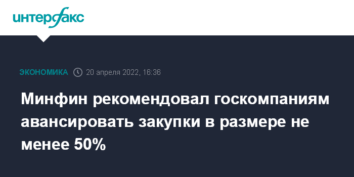 Москва. 20 апреля. INTERFAX.RU - Минфин посоветовал госкомпаниям авансировать свои закупки в размере не менее 50% от цены договора, говорится в письме на сайте ведомства.