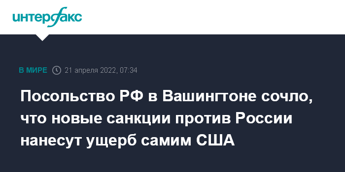 Москва. 21 апреля. INTERFAX.RU - Новые антироссийские санкции приобретают все более абсурдный характер, вместо ожидаемых Вашингтоном потрясений в России нанесут вред самим Соединенным Штатам, говорится в заявлении посольства РФ в США, опубликованном в среду в телеграм-канале.