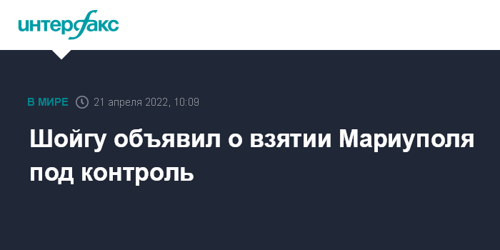 Москва. 21 апреля. INTERFAX.RU - Министр обороны РФ Сергей Шойгу доложил президенту Владимиру Путину об освобождении Мариуполя.