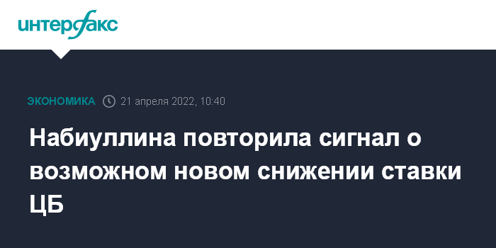 Москва. 21 апреля. INTERFAX.RU - Председатель Банка России Эльвира Набиуллина повторила сигнал о будущей направленности денежно-кредитной политики: регулятор будет рассматривать возможность дальнейшего снижения ключевой ставки на следующих заседаниях.