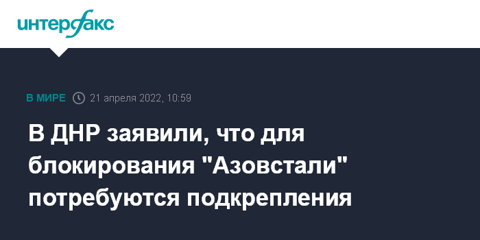 Москва. 21 апреля. INTERFAX.RU - Для блокирования остатков украинских сил на территории мариупольского комбината "Азовсталь" потребуется усиление личного состава сил Донецкой народной республики, заявил руководитель администрации главы ДНР Алексей Никаноров.