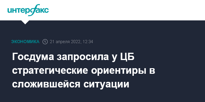 Москва. 21 апреля. INTERFAX.RU - Госдума утвердила отчет Банка России за 2021 год и попросила регулятора представить четкие стратегические ориентиры в условиях текущего трансформационного вызова.