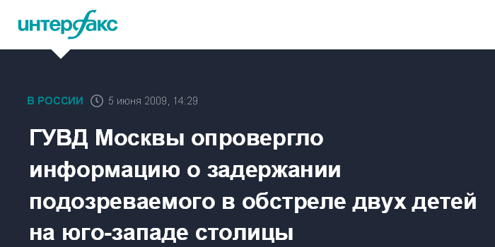 Москва. 5 июня. INTERFAX.RU - В ГУВД Москвы опровергли информацию о том, что задержан подозреваемый в обстреле из пневматического оружия двух детей в Юго-Западном округе столицы.