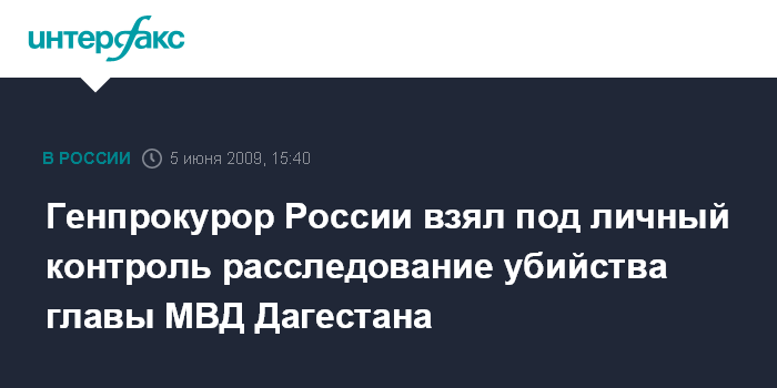 Москва. 5 июня. INTERFAX.RU - Генеральный прокурор России Юрий Чайка взял под личный контроль расследование убийства главы МВД Дагестана Адильгерея Магомедтагирова, заявила "Интерфаксу" в пятницу официальный представитель Генпрокуратуры РФ Марина Гриднева.