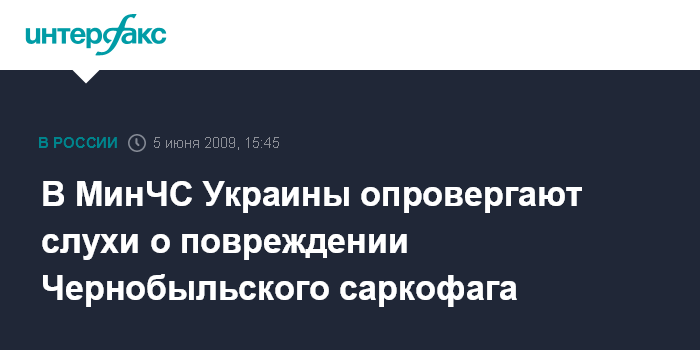 Москва. 5 июня. INTERFAX.RU - Пресс-служба МинЧС Украины опровергает слухи о якобы повреждении саркофага на Чернобыльской АЭС. Там заверили, что в последнее время никаких техногенных аварий с выбросом опасных химических веществ на территории страны не происходило.
