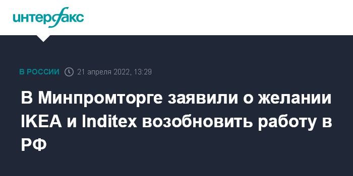 Москва. 21 апреля. INTERFAX.RU - IKEA и Inditex, приостановившие работу магазинов в России, хотят вернуться на российский рынок, заявил замглавы Минпромторга РФ Виктор Евтухов.