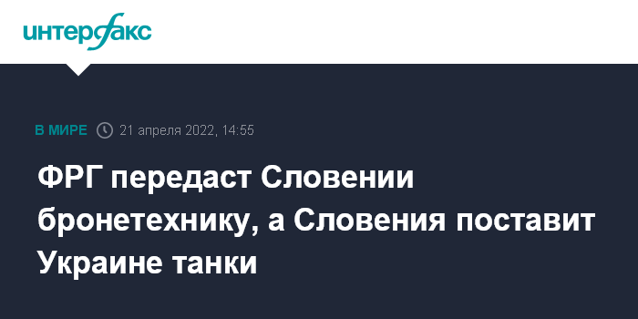 Москва. 21 апреля. INTERFAX.RU - Словения передаст Украине советские танки T-72, взамен Германия поставит Словении боевые машины пехоты Marder и бронетранспортеры Fuchs, сообщает немецкое информагентство DPA.