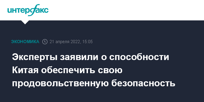 Москва. 21 апреля. INTERFAX.RU - Китай способен обеспечить свою продовольственную безопасность, в частности, в зерновой сфере. Об этом заявили эксперты в области сельского хозяйства на конференции China Agricultural Outlook-2022.