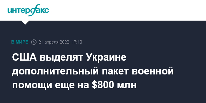 В середине апреля Байден одобрил пакет помощи Украине в области безопасности на сумму $800 млн, включающий артиллерийские системы, бронетранспортеры и вертолеты.