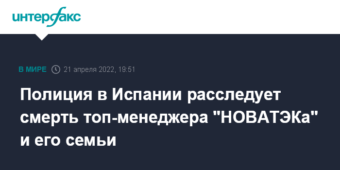 Москва. 21 апреля. INTERFAX.RU - Сотрудники полиции Каталонии проводят расследование в связи с гибелью бывшего члена правления НОВАТЭК Сергея Протосени, а также его жены и дочери, сообщают в четверг испанские СМИ.