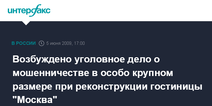 Москва. 5 июня. INTERFAX.RU - Москва. 5 июня. ИНТЕРФАКС - Следственные органы возбудили уголовное дело по факту мошеннического завладения в ходе реконструкции гостиницы "Москва" более $87 млн.