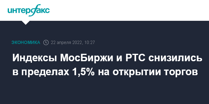 Москва. 22 апреля. INTERFAX.RU - Торги на российском рынке акций в пятницу начались со снижения на фоне санкционного давления и на сигналах от Федрезерва США об ужесточении монетарной политики.