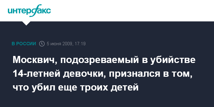 Москва. 5 июня. INTERFAX.RU - Молодой москвич, задержанный по подозрению в убийстве своей 14-летней племянницы, сознался также в убийстве трех мальчиков четыре года назад.