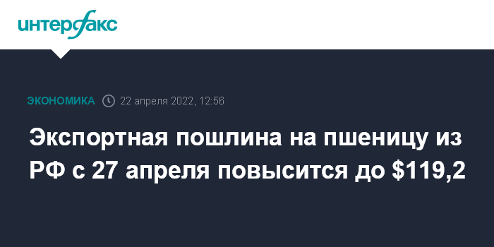 Москва. 22 апреля. INTERFAX.RU - Экспортная пошлина на пшеницу из РФ с 27 апреля повысится до $119,2 со $110,7 за тонну, сообщил Минсельхоз.
