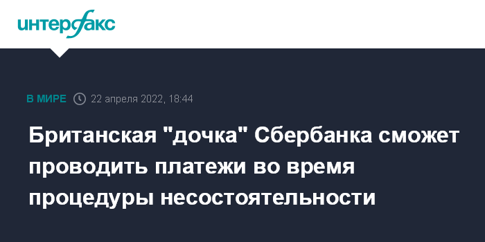 Москва. 22 апреля. INTERFAX.RU - Управление по осуществлению финансовых санкций Великобритании (OFSI) разрешило "дочке" Сбербанка – Sberbank CIB (UK) Ltd – осуществлять платежи в рамках "базовых потребностей" на период до 3 апреля 2023 года.