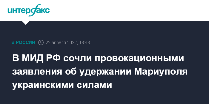Москва. 22 апреля. INTERFAX.RU - В Москве считают провокационными заявления Госдепа США о том, что Мариуполь по-прежнему находится под контролем украинских сил, заявила в пятницу официальный представитель МИД РФ Мария Захарова.