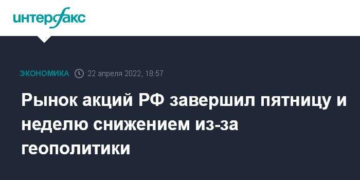 Москва. 22 апреля. INTERFAX.RU - Рынок акций РФ завершил торги в пятницу снижением из-за геополитической напряженности в условиях санкционного давления Запада на Россию и неопределенности в переговорах о завершении конфликта РФ-Украина; индекс МосБиржи опустился в район 2230 пунктов (минимум с 24 февраля), индекс РТС упал ниже 930 пунктов на фоне ослабления рубля.