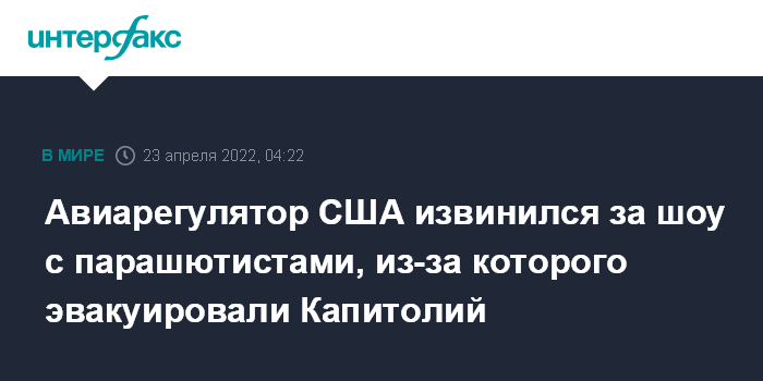 Москва. 23 апреля. INTERFAX.RU - Федеральное управление гражданской авиации США (FAA) признало, что не уведомляло полицию Капитолия о шоу с парашютистами на близлежащем бейсбольном стадионе, из-за чего здание Конгресса США было эвакуировано, сообщает NBC News.