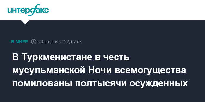 Москва. 23 апреля. INTERFAX.RU - Президент Туркменистана Сердар Бердымухамедов помиловал 514 осужденных в честь Gadyr gijesi (Ночи всемогущества), которая отмечается на 27-й день мусульманского поста, сообщает в субботу газета "Нейтральный Туркменистан".