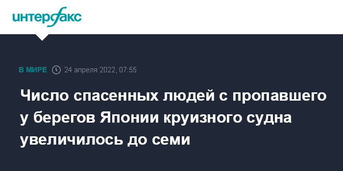 Москва. 24 апреля. INTERFAX.RU - Береговая охрана Японии спасла еще трех человек с пропавшего в субботу круизного судна Kazu 1. Об этом пишет Kyodo.