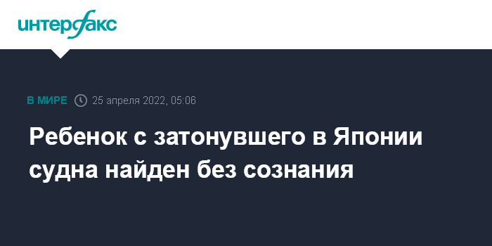 Москва. 25 апреля. INTERFAX.RU - Ребенок с туристического судна, которое пропало у берегов Хоккайдо в субботу, был найден без сознания, сообщает телеканал NHK.