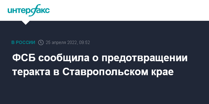 Москва. 25 апреля. INTERFAX.RU - ФСБ в Ставрополе задержала сторонника запрещенной в РФ террористической организации ИГИЛ, готовившего теракт на объекте транспортной инфраструктуры в Ставропольском крае, сообщает в понедельник Центр общественных связей службы.