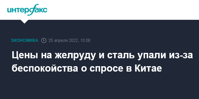 Москва. 25 апреля. INTERFAX.RU - Цены на железную руду и сталь резко снижаются на беспокойстве рынка по поводу падения спроса из-за распространения новой волны коронавируса в Китае и перспектив принятия со стороны китайского правительства жестких мер борьбы с пандемией.