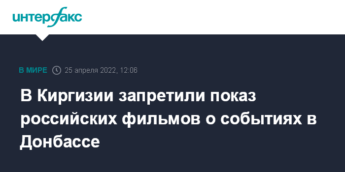 Москва. 25 апреля. INTERFAX.RU - Власти Киргизии запретили показ российских художественных фильмов о событиях в Донбассе, все ранее выданные прокатные удостоверения отозваны.
