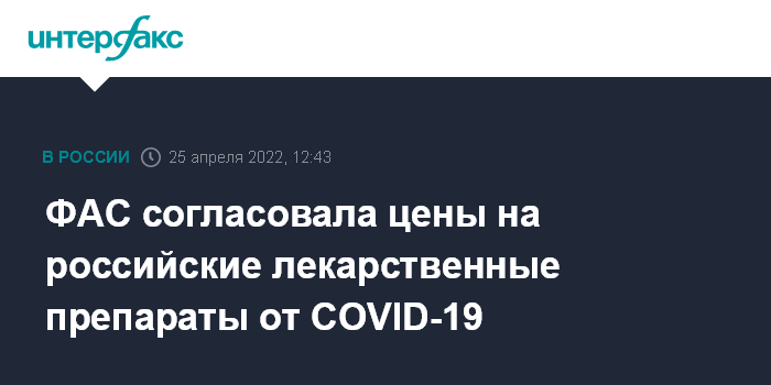 Москва. 25 апреля. INTERFAX.RU - Федеральная антимонопольная служба (ФАС) согласовала цены на отечественные лекарственные препараты от коронавируса; в частности, цена на курс препарата "Молнупиравир" составит около 6 тысяч рублей, сообщили в ведомстве.