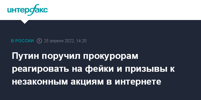 Москва. 25 апреля. INTERFAX.RU - Президент Владимир Путин потребовал, чтобы прокуроры незамедлительно реагировали на распространение в интернете фейков и попытки организации незаконных акций. Он сказал это на на коллегии Генпрокуратуры 25 апреля.