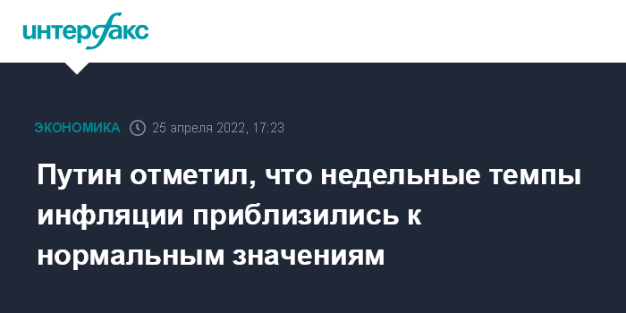 Москва. 25 апреля. INTERFAX.RU - Недельные темпы инфляции в РФ приблизились к нормальным значениям на фоне стабилизации ситуации на валютном рынке, нормализации потребительского спроса, заявил президент Владимир Путин.