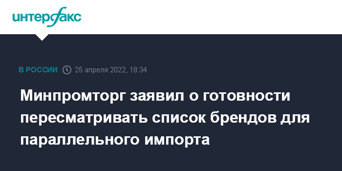 Москва. 25 апреля. INTERFAX.RU - Минпромторг РФ готов пересматривать перечень товаров и брендов, в отношении которых будет разрешен параллельный импорт (вывоз в РФ без получения разрешения правообладателя при начале поставок в других странах мира), при согласии производителей возобновить поставки.