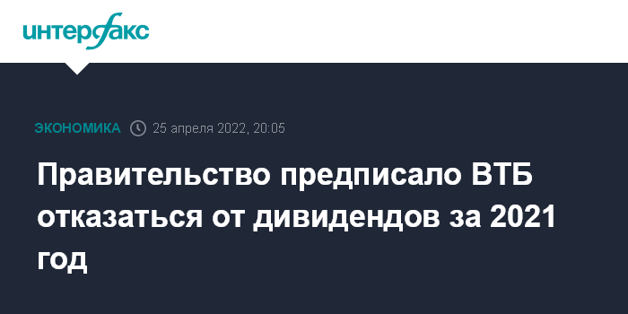 Москва. 25 апреля. INTERFAX.RU - Правительство РФ дало распоряжение Минфину и Росимуществу при подготовке директив для участия в наблюдательном совете ВТБ не предусматривать выплату дивидендов за 2021 год на обыкновенные и привилегированные акции обоих типов.