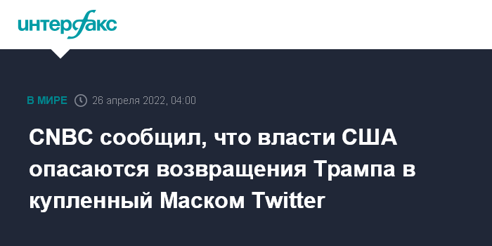 Москва. 26 апреля. INTERFAX.RU - Официальные лица в администрации президента США Джо Байдена выражают опасения, что Илон Маск позволит вернуться в Twitter экс-президенту Дональду Трампу, сообщает CNBC со ссылкой на источники.