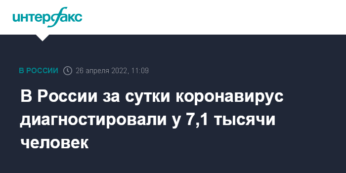 Москва. 26 апреля. INTERFAX.RU - Суточный прирост новых заболевших коронавирусной инфекцией в РФ составил 7 107 случаев, госпитализированы за сутки 3 161 человек, следует из данных оперативного штаба, обнародованных во вторник.