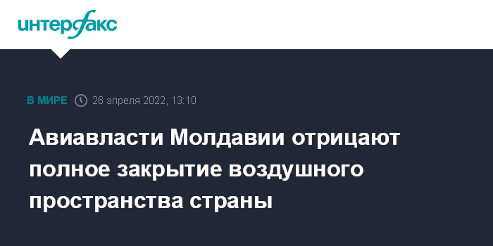 Москва. 26 апреля. INTERFAX.RU - Орган гражданской авиации (ОГА) Молдавии опроверг сообщения отдельных СМИ о том, что воздушное пространство республики закрыто и поэтому самолеты облетают Молдавию в радиусе около 100 км.