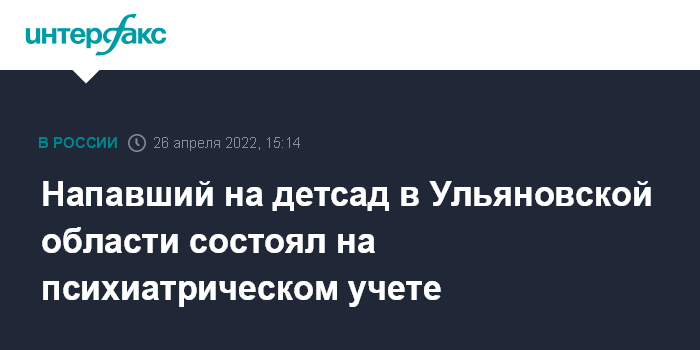 Москва. 26 апреля. INTERFAX.RU - Предполагаемый убийца детей в детском саду Ульяновской области состоит на психиатрическом учете, сообщила во вторник уполномоченная по правам человека в РФ Татьяна Москалькова.