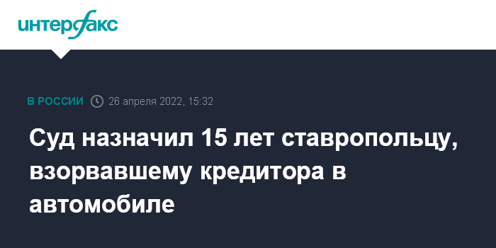 Москва. 26 апреля. INTERFAX.RU - Ставропольский краевой суд приговорил к длительному сроку заключения местного жителя, обвиняемого в подрыве автомобиля кредитора и его убийстве, сообщает пресс-служба суда.