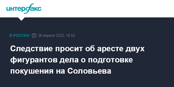 Москва. 26 апреля. INTERFAX.RU - Басманный суд Москвы зарегистрировал ходатайства следствия об аресте двух фигурантов уголовного дела о подготовке убийства журналиста Владимира Соловьева, сообщили "Интерфаксу" в пресс-службе суда.