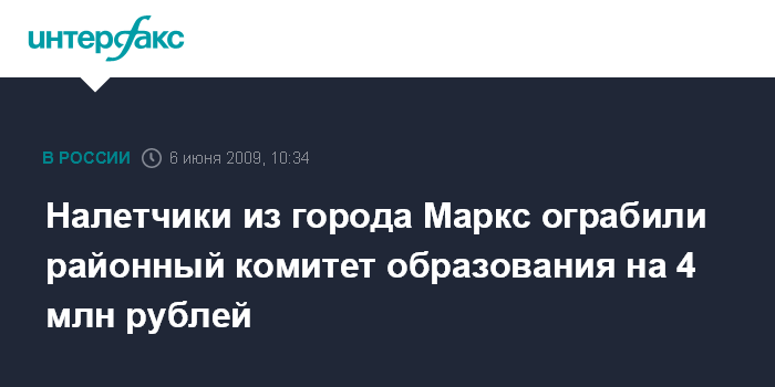 Москва. 6 июня. INTERFAX.RU - В городе Маркс Саратовской области злоумышленники взломали кассу в районном комитете образования и похитили более 4 млн рублей, предназначенных для выплаты зарплаты, сообщил "Интерфаксу" источник в правоохранительных органах.