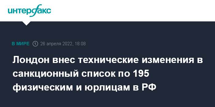 Москва. 26 апреля. INTERFAX.RU - Власти Великобритании во вторник распространили обновленный санкционный список с техническими изменениями в отношении включенных в него 195 российских физических и юридических лиц, новых фигурантов в списке нет.