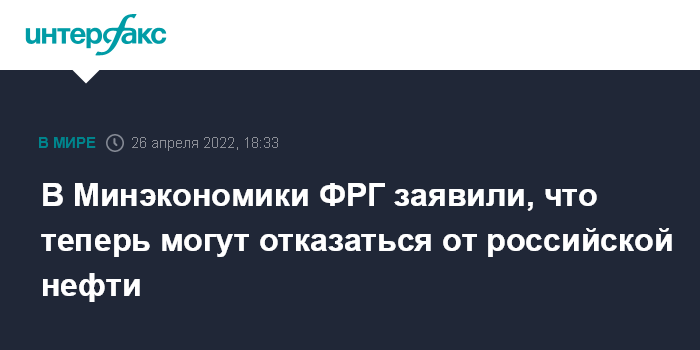 Москва. 26 апреля. INTERFAX.RU - Министр экономики Германии Роберт Хабек во вторник заявил, что теперь Германия может отказаться от российской нефти.