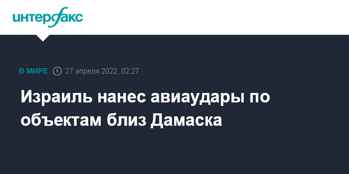 Москва. 27 апреля. INTERFAX.RU - Израильские авиаудары были нанесены по объектам близ Дамаска рано утром в среду, сообщают сирийские СМИ.
