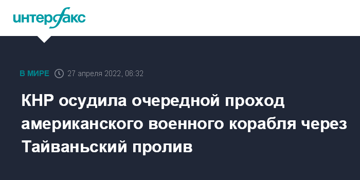 Москва. 27 апреля. INTERFAX.RU - Провокационным шагом США, подрывающим мир и стабильность в регионе, назвал представитель Восточной зоны боевого командования Народно-освободительной армии Китая (НОАК) Ши И очередной проход американского военного корабля через Тайванский пролив.