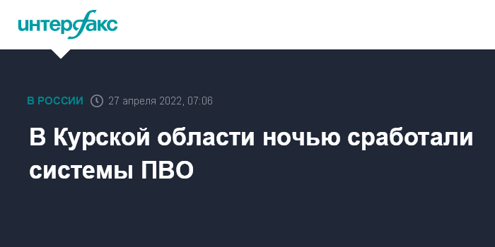 Москва. 27 апреля. INTERFAX.RU - Губернатор Курской области Роман Старовойт сообщил, что в среду в регионе сработала система ПВО.