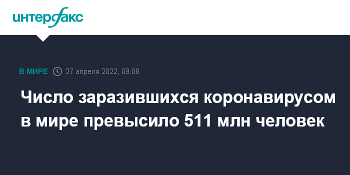 Москва. 27 апреля. INTERFAX.RU - Число зарегистрированных случаев заражения коронавирусом в мире на утро среды достигло 511 051 283, свидетельствуют данные американского университета Джонса Хопкинса.