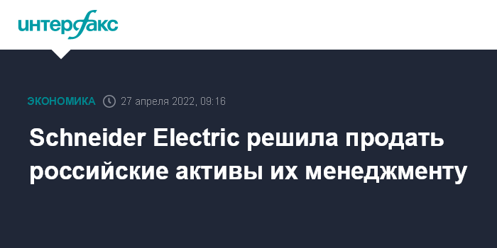 Москва. 27 апреля. INTERFAX.RU - Французская Schneider Electric объявила, что намерена продать свои российские активы местному руководству, согласовав сделку с местными властями.