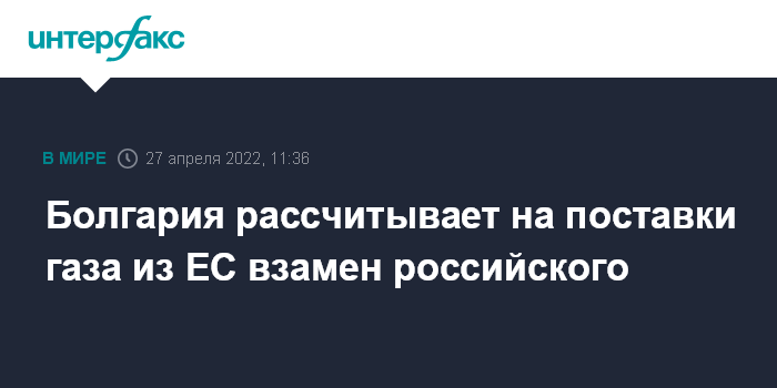 Вечером 26 апреля Минэнерго Болгарии сообщило, что "Булгаргаз" получил уведомление ООО "Газпром экспорт" о том, что с 27 апреля будут остановлены поставки газа. В Софии считают, что "болгарская сторона полностью выполнила свои обязательства и произвела все платежи, требуемые по настоящему договору, своевременно, строго и в соответствии с его пунктами", тогда как предложенный Москвой новый порядок оплаты "не соответствует действующему контракту до конца этого года и создает значительные риски для Болгарии, в том числе осуществление платежей без получения каких-либо поставок газа с российской стороны".