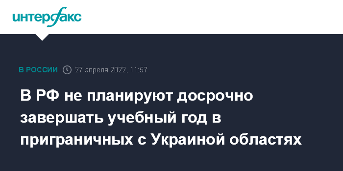 Москва. 27 апреля. INTERFAX.RU - Минпросвещения не рассматривает вопрос о преждевременном прекращении учебного года в российских школах, расположенных в приграничных с Украиной районах, сообщил министр просвещения РФ Сергей Кравцов.