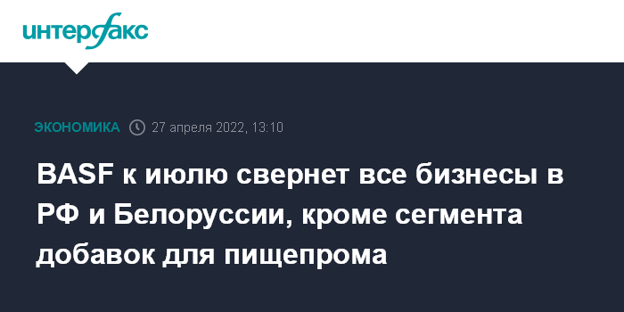Москва. 27 апреля. INTERFAX.RU - Немецкая химическая компания BASF SE, одна из крупнейших в мире, намерена к июлю свернуть всю деятельность в России и Белоруссии, кроме производства добавок для пищевой промышленности.